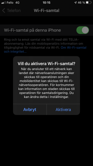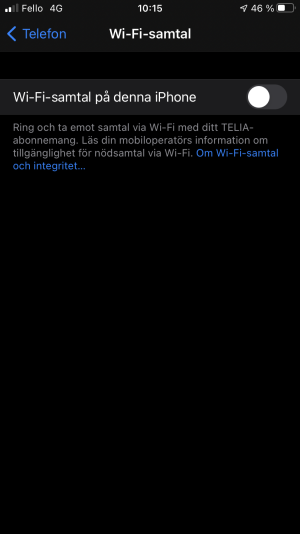 Dra reglaget till höger för att aktivera wifi-samtal.