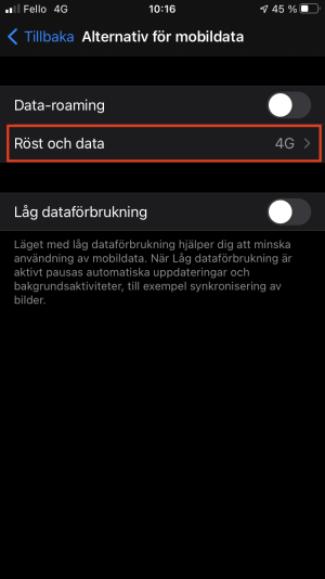 Mobilen hittar inte 4G/VoLTE: Ändra Röst och data till Av (steg 4), starta om mobilen. Slå sedan på Röst och data igen.
