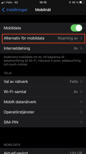 Klicka på alternativ för mobildata.